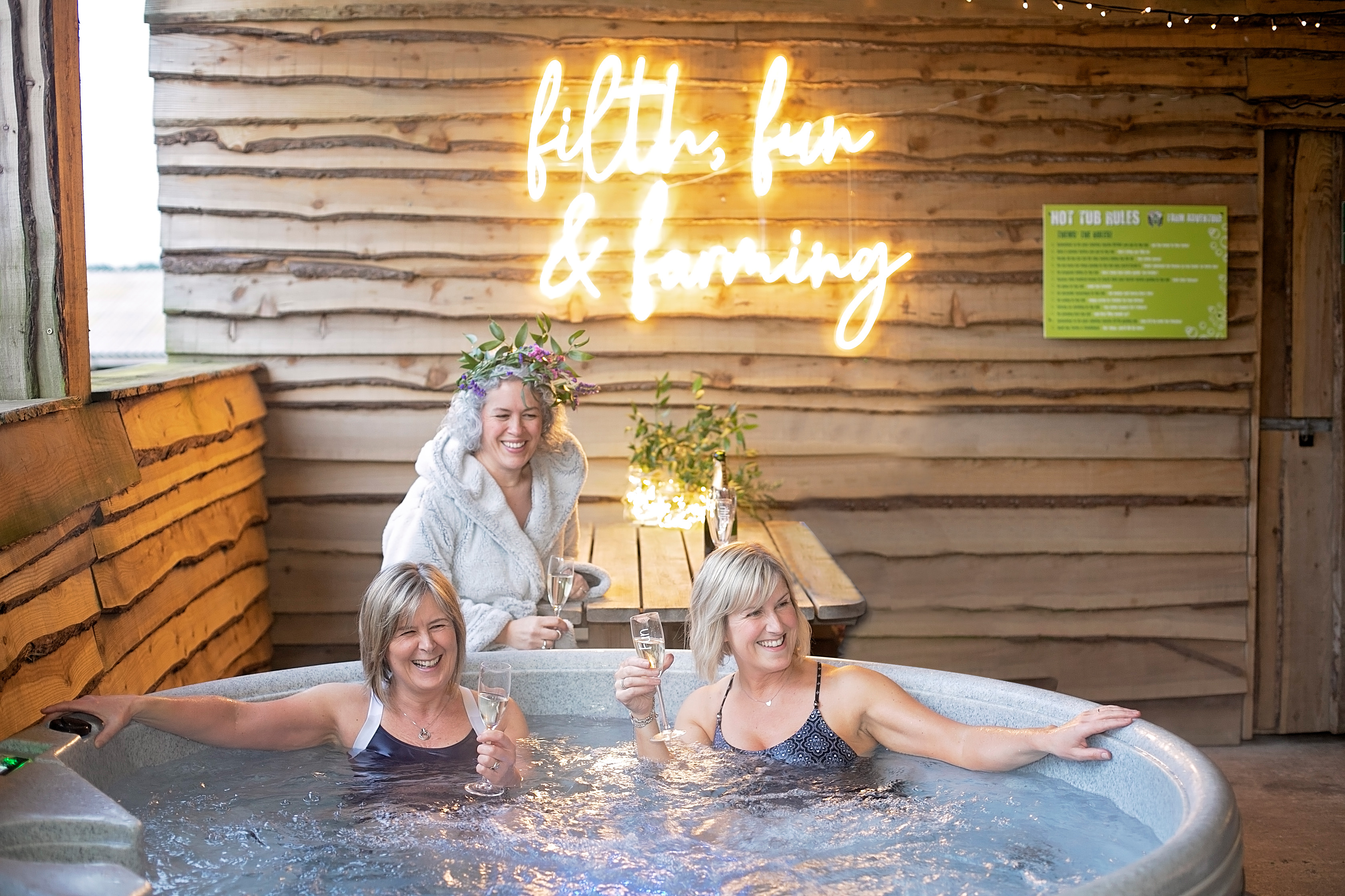And when it’s all been really too tough, you can take a dip in our outdoor hot tubs. Enjoying the fresh country air. But undercover for those nostalgic sounds of rain on the roof!